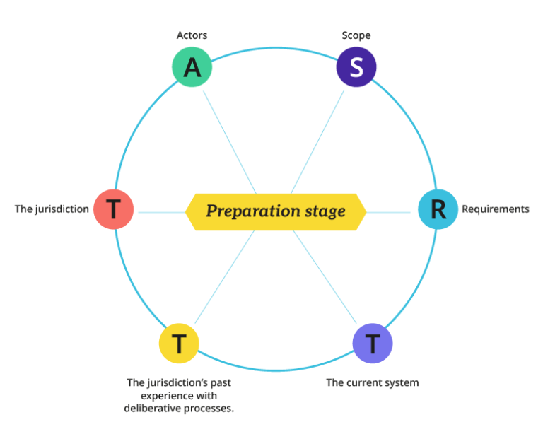 This order of questions was chosen carefully, because in a number of cases, the answers to one question will greatly influence the answers to a different question. For example, in the preparation stage, decisions about requirements will depend on decisions about actors, which in turn will depend on decisions about jurisdictions. And in the design stage, decisions about how to allocate roles between bodies will depend on decisions about which functions and/or categories of decisions are within the scope of the design.